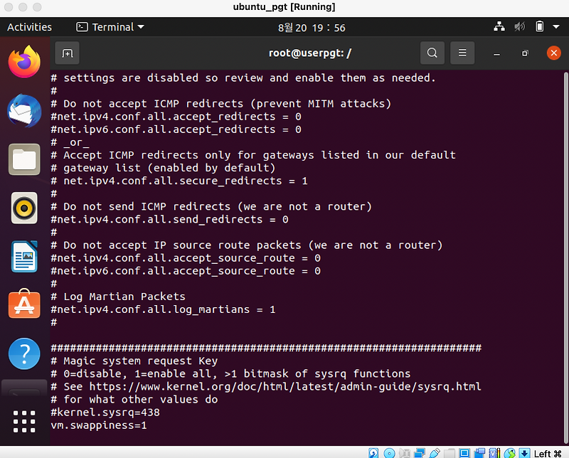 1. swappiness 는 스왑 메모리의 활용정도를 뜻함 60이 기본값이며 db를 활용하는 서버에서는 보통 1을 사용하여 스왑메모리를 사용하는 적극성을 최소화 시킨다. 2. 현재 리눅스의 swappiness 확인하기 sysctl vm.swappiness 3. vm.swappiness 를 1로 변경시켜보자 먼저 /etc/sysctl.conf 파일을 열자 vi /etc/sysctl.conf 맨 아랫줄로 이동해서 다음 내용을 추가하자 vm.swappiness=1 재부팅한다 reboot 재부팅이 됐으면 다시 명령어 입력으로 확인해보자 sysctl vm.swappiness