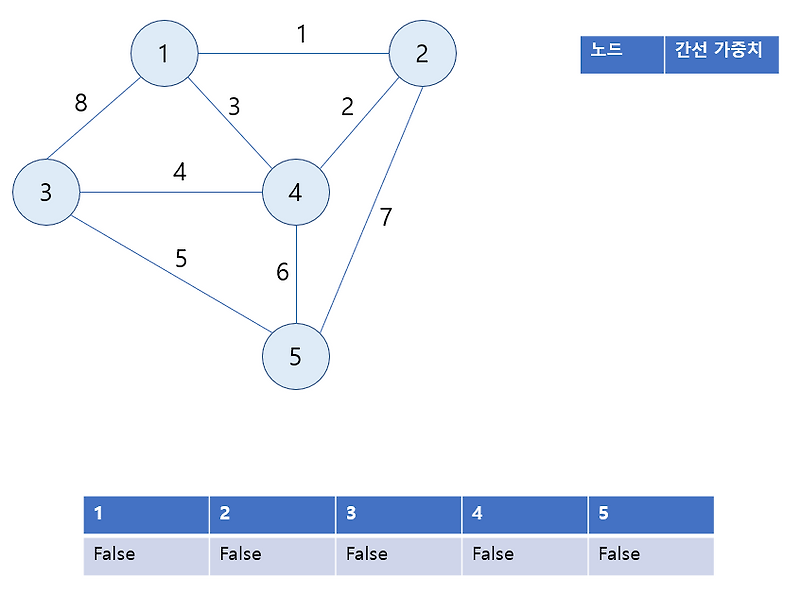 - 시작 단계에서는 시작 정점만이 MST 집합에 포함된다.